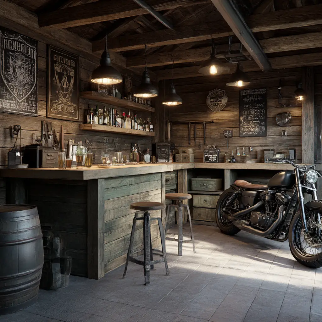 Give your garage a cozy pub-like atmosphere with wooden finishes, exposed beams, and a traditional bar counter. Pair this with a classic pool table and soft lighting for a warm, old-world charm.