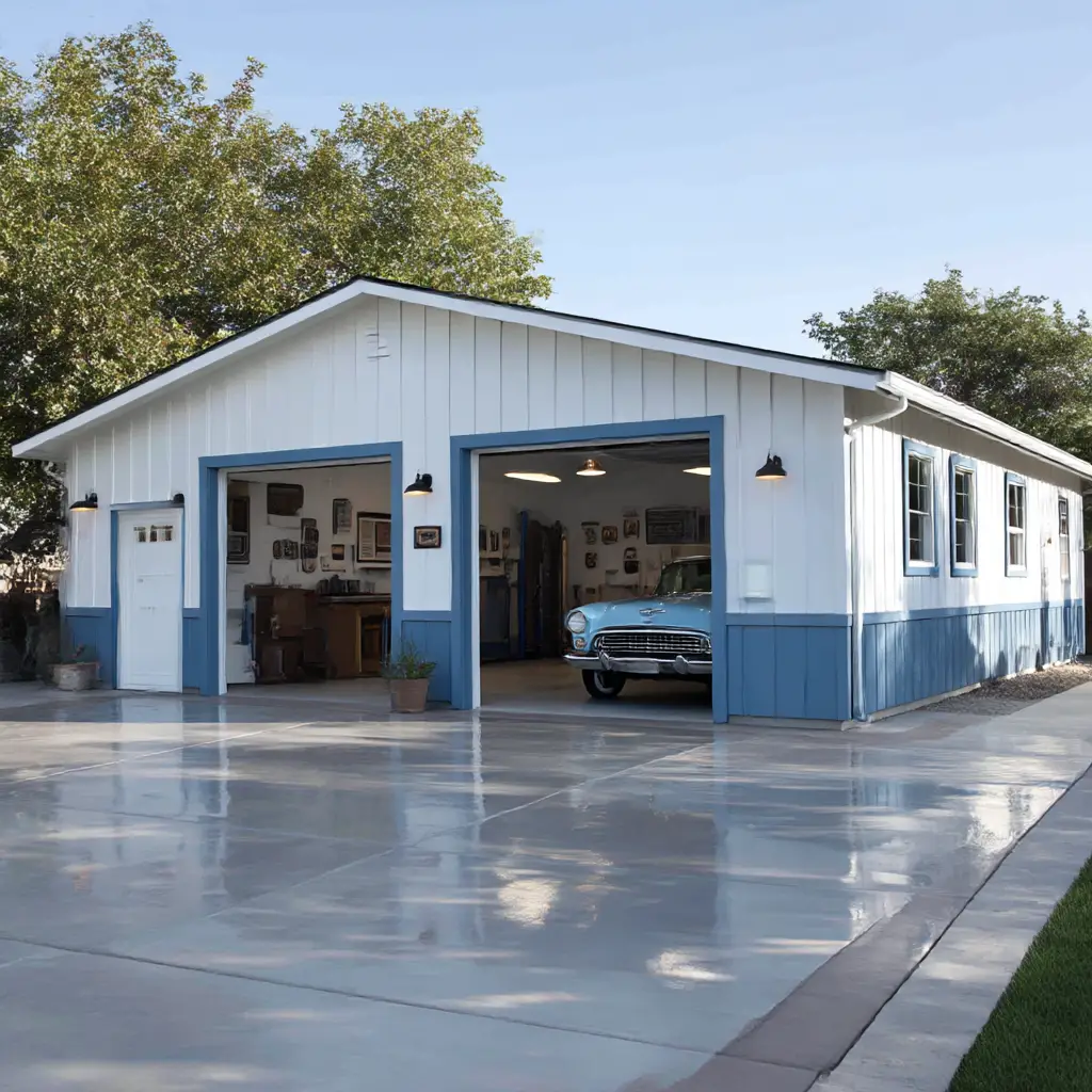 A rich blue epoxy floor adds a unique, cool-toned vibe. It feels refreshing and modern, perfect for garages that double as recreational or hobby spaces.